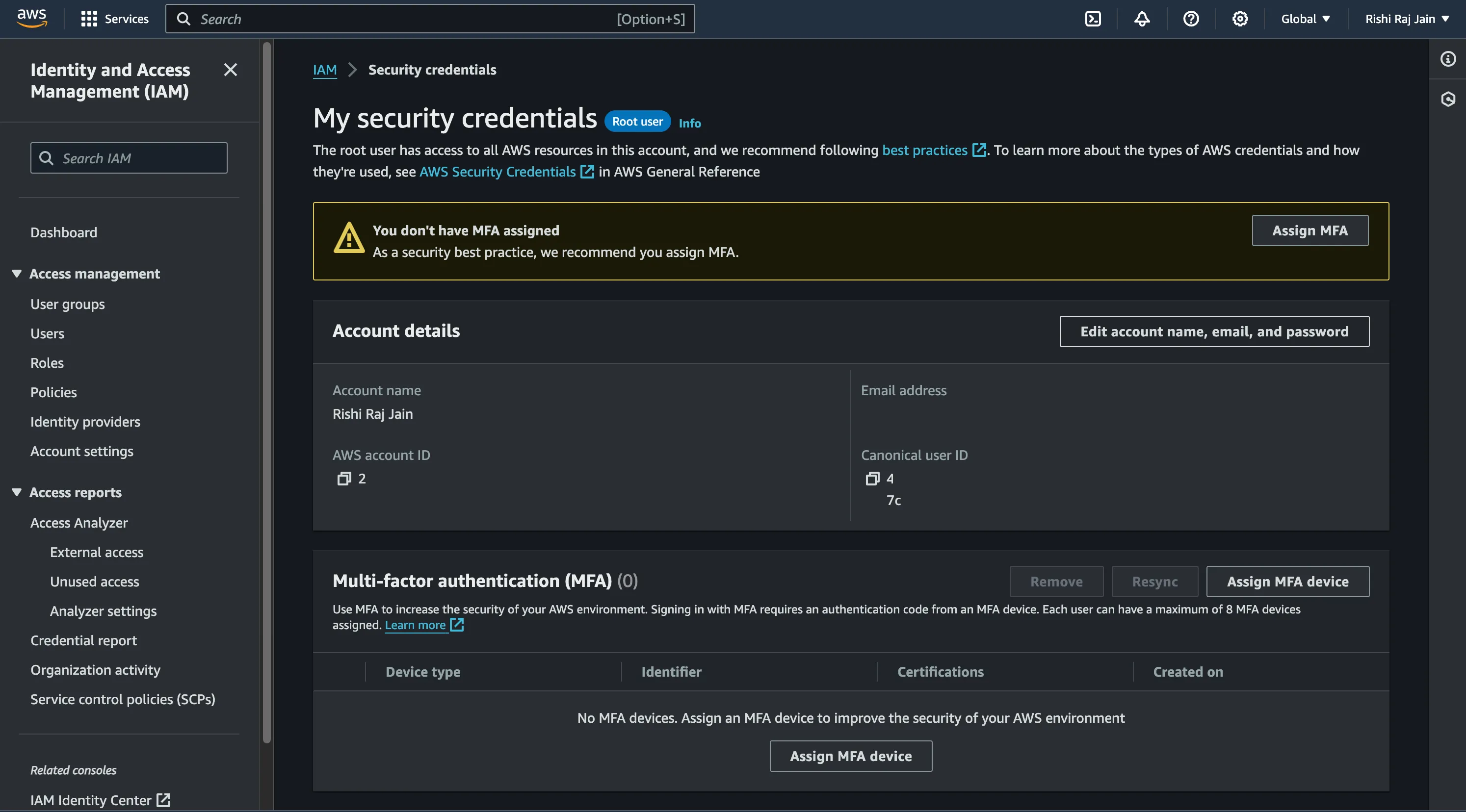 In the navigation bar on the upper right in your AWS account, click on your name, and then choose **Security credentials**.